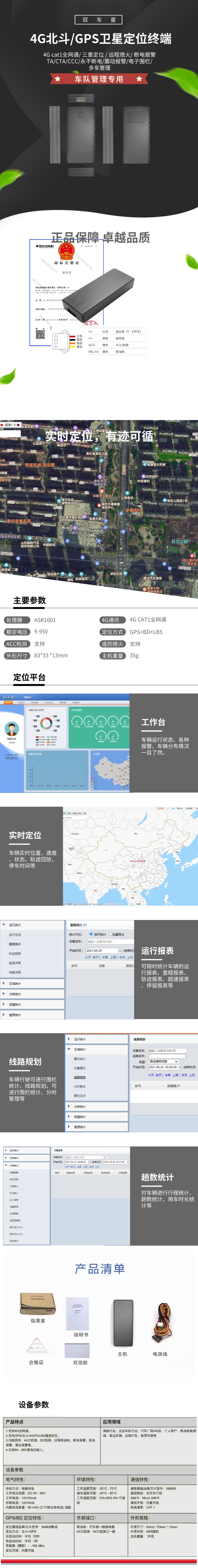 產品特色 | 4G通訊:4G CAT1全網通,兼容2G網絡; 三重定位:GPS+BD+LBS定位,更快更精準; 震動防盜,斷電報警,電池低電報警,進出電子圍欄報警,超速報警,位移報警 |